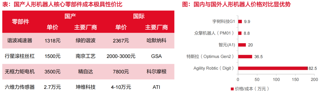 图6:国内外人形机器人核心零部件成本&人形机器人价格对比