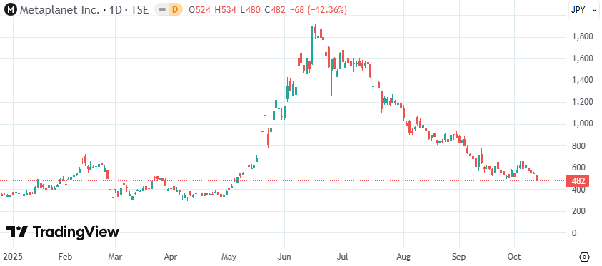 然而,市场风向似乎在悄然转变。截至周二(10月14日)日股收盘,Metaplanet的股价大幅下跌12.36%,报收每股482日元,创下了自5月8日以来的最低收盘价。与今年6月的高点相比,股价已累计下跌超过70%,市值也大幅缩水至约36亿美元。