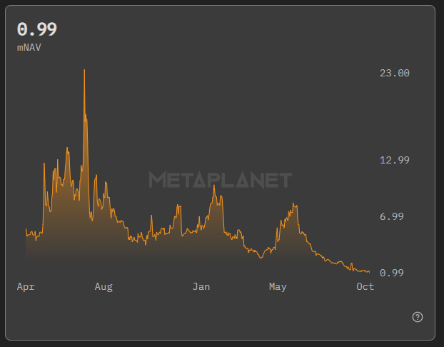 根据Metaplanet官网公布的数据,其mNAV(市值与债务总额除以比特币持仓价值的比例)已降至0.99,这意味着公司的企业价值已经低于其储备的比特币价值。这是自2024年购买比特币以来的首次,此前该数据最高曾达到23倍左右,显示出市场估值的巨大波动。