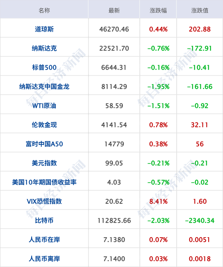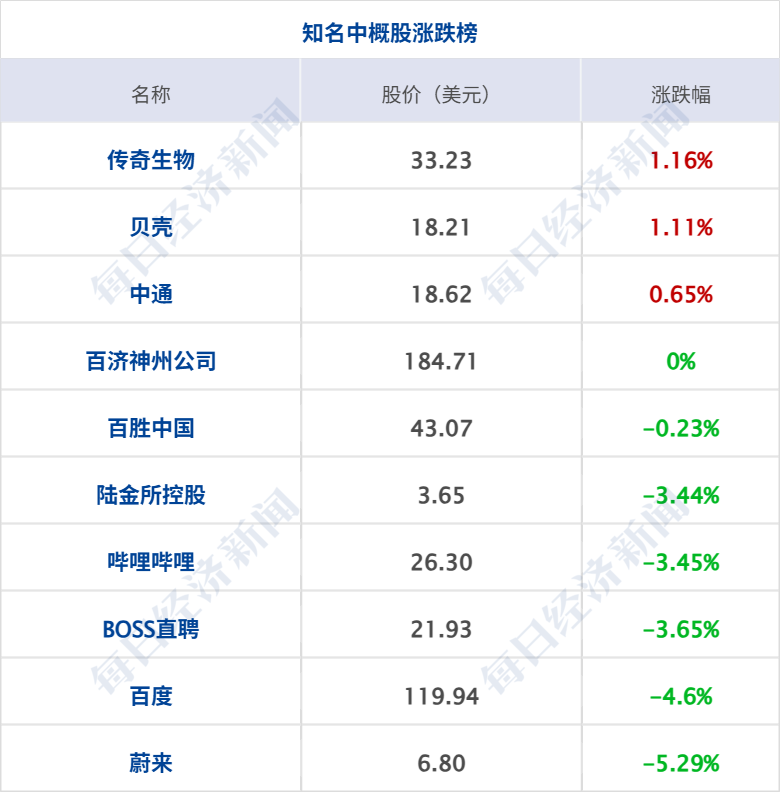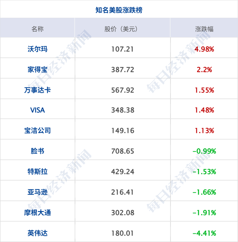 美股三大指数收盘涨跌不一,道指涨0.44%,纳指跌0.76%,标普500指数跌0.16%,大型科技股多数下跌,英伟达跌超4%,博通跌超3%,特斯拉、亚马逊跌超1%;半导体、加密储备概念股跌幅居前,英特尔跌超4%,Strategy、Coinbase跌超4%,日月光半导体跌超3%,美光科技、Arm跌超2%;稀土概念、航空服务、基础设施运营板块走高,捷蓝航空涨近8%,卡特彼勒、达美航空涨超4%,美国航空涨超3%。沃尔玛百货收涨5%,创收盘历史新高。纳斯达克中国金龙指数跌1.95%,中概股普遍下跌,蔚来跌超5%,百度跌超4%,哔哩哔哩跌超3%,世纪互联、阿里巴巴、小鹏汽车跌超2%。