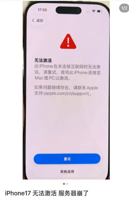 多位用户在社交平台晒出激活界面截图,系统提示显示:"此iPhone在未连接互联网时无法激活。请重试,或将此iPhone连接至Mac或PC以激活。"尽管用户尝试更换Wi-Fi网络、使用蜂窝数据,甚至通过有线连接电脑等常规方法,均未能解决激活问题。