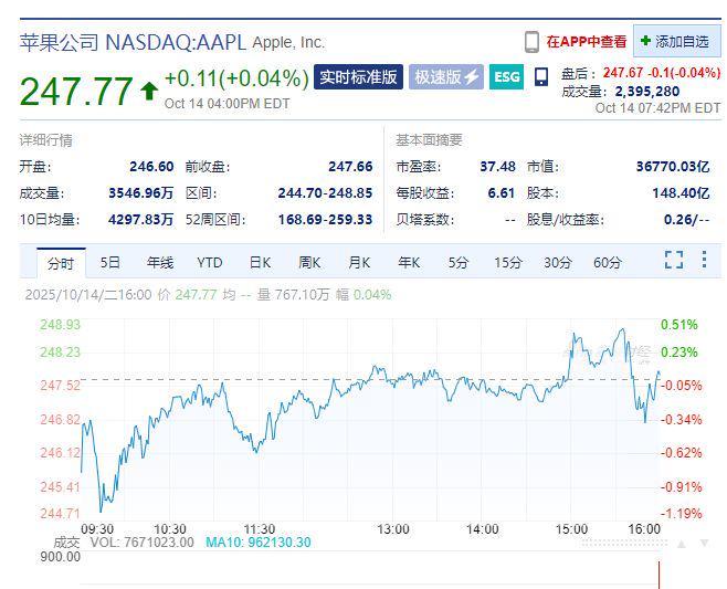 有科技行业分析师指出:"对于苹果这样体量的企业,在旗舰产品发售关键期出现如此大面积、长时间的服务中断,实属罕见。"截至当地时间10月14日收盘,苹果股价报247.77美元,涨幅0.04%,市值约3.7万亿美元。