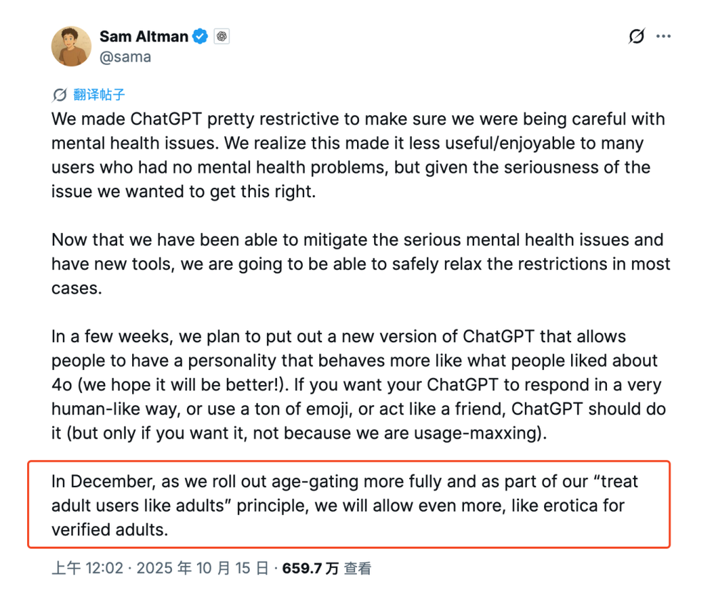 北京时间10月15日,OpenAI CEO萨姆·奥尔特曼在推特宣布,随着全面年龄限制系统的实施,12月将为认证成年用户开放更多内容,明确提及包含色情内容。这一表态与其8月接受采访时的立场形成鲜明对比——当时他骄傲地宣称'ChatGPT中绝不会出现性爱机器人'。