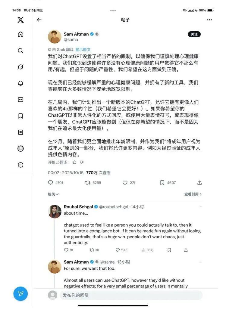 当Sam Altman宣布将推出成人模式时,新一轮争议再次爆发。这表明任何试图规范AI人格的尝试,都会遭遇用户群体的激烈反弹。