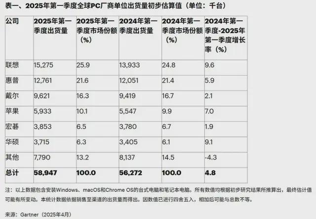 根据Canalys数据,2025年第一季度,联想的台式机与笔记本产品在美国PC市场合计拿下18.4%的市场份额,同时以19.9%的同比增长率跑赢14.7%的市场平均水平。此外,联想与头部品牌的差距持续收窄,与排名第一、第二的惠普(24.3%)和戴尔(23.0%)之间的市场份额差距明显缩小,市场竞争格局正逐步被改写。