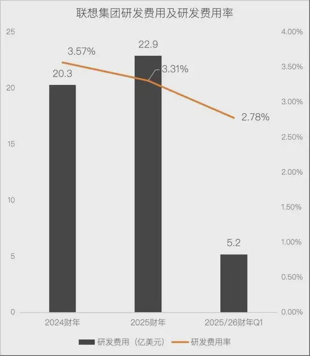 财报数据显示,2022年、2023年和2024年,联想的研发费用分别为21.95亿美元、20.28亿美元以及22.88亿美元,虽然看似在稳步增加,但其研发费用率却分别为3.54%、3.57%以及3.31%,实际上还在原地踏步。