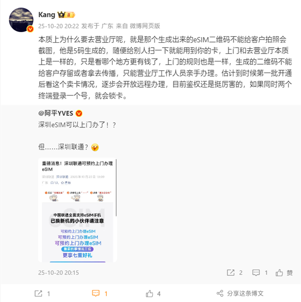 即便开通了上门服务,这一规则也依然适用。生成的二维码不能给客户存留或者拿去传播,只能由营业厅工作人员亲手办理,并当场激活使用。博主还强调,目前eSIM的鉴权机制相当严格,如果同时有两个终端登录同一个号码,系统就会自动锁卡,以防止未经授权的使用。