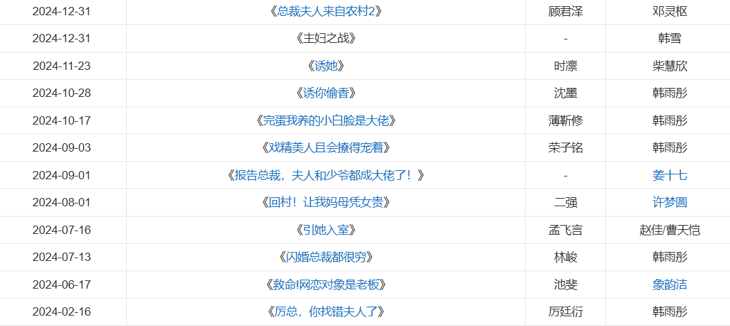 这部剧也助两人飞升成了短国顶流,戏约不断,之后他们几乎成了固定cp,去年曾辉拍了十几部短剧,有一半都是和韩雨彤搭档。