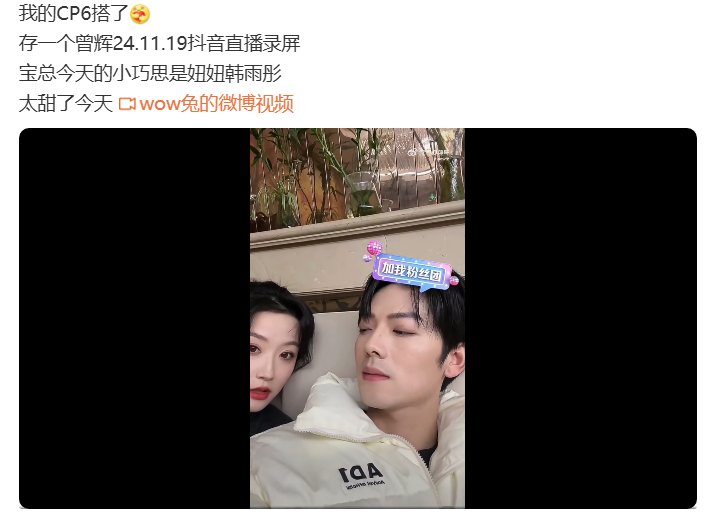 有次直播,曾辉下意识叫了韩雨彤的小名“妞妞”,心细的粉丝当时就嗅到两人之间似乎有粉红泡泡。
