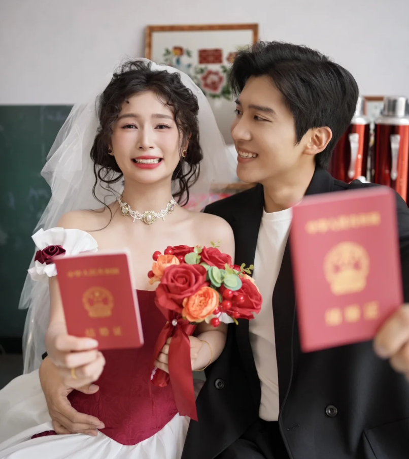 拍结婚照那天,他们还特地买了新裙子和新西服,这氛围连头发丝都是甜的。