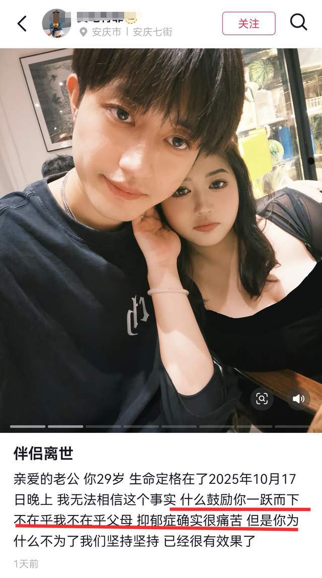 近日,安徽安庆一名女子在网络上发文,悼念她年仅29岁的丈夫。据她透露,丈夫在10月17日晚上不幸坠楼离世,这一突如其来的变故让她无法接受,除了悲痛,更多的是无尽的抱怨和自责。
