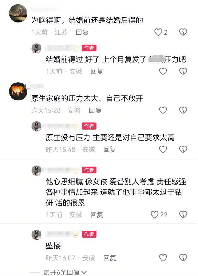 据妻子在评论区的互动消息,杨高耸在结婚前曾有过抑郁,但当时已经好了。然而,近期病情又复发了,可能是生活中的压力所致。但妻子强调,这种压力并非来自家庭,而是丈夫对自己的要求过高。