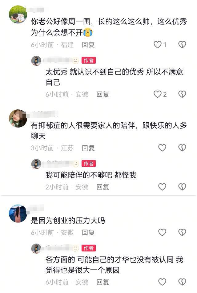 据评论区的熟人透露,去世的男子名叫杨高耸,他是一个特别温暖和帅气的人,职业是一名摄影师。他们于2023年10月份结婚,至今不过两年。两人一见钟情,三个月就见了父母,半年后领证,那时的他们幸福满满,丝毫看不出抑郁的迹象。那么,为何会出现后来的悲剧呢?