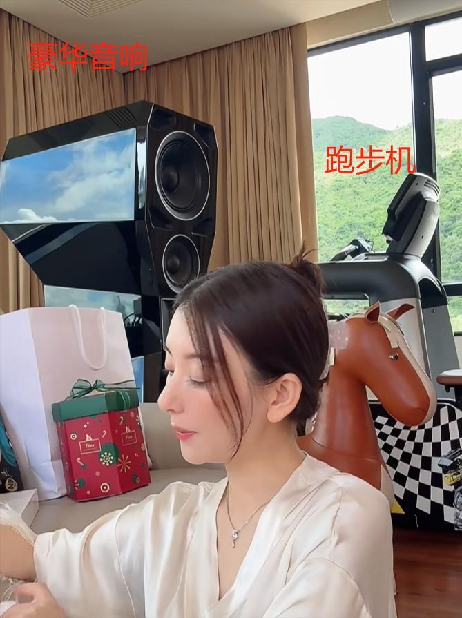 方媛的家中拥有一间宽敞的客厅,至少两面墙安装了超大观景窗,窗外青山绿水、蓝天高楼尽收眼底,令人心旷神怡。客厅里还摆放着跑步机等健身器材,方便她边欣赏风景边运动。此外,客厅里还有一个大型音响,兴致来时可以播放喜爱的音乐。主沙发正对中央观景窗,视野极为开阔。