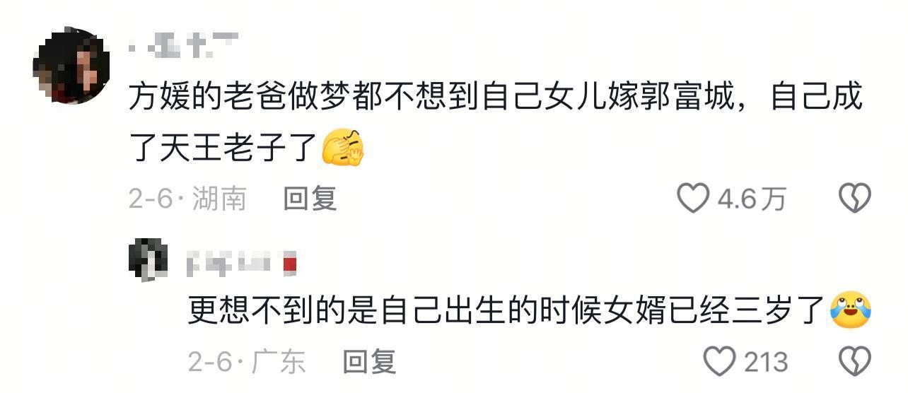 两人虽然年龄相差22岁,但还是走到了一起。当初方媛还在节目上说过,自己看上郭富城,就是因为他长得帅。方媛其实长得也很漂亮,不少网友还觉得她神似钟欣潼和杨颖等人,只是让人啼笑皆非的是,方媛的父亲都比郭富城小了3岁。