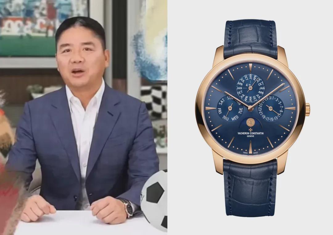 这些年刘强东其实收藏了不少壕表,AI数字人首次直播带货,就搭配了一块70万的江诗丹顿传承系列超薄万年历手表,同样是优雅范儿的蓝金配色。
