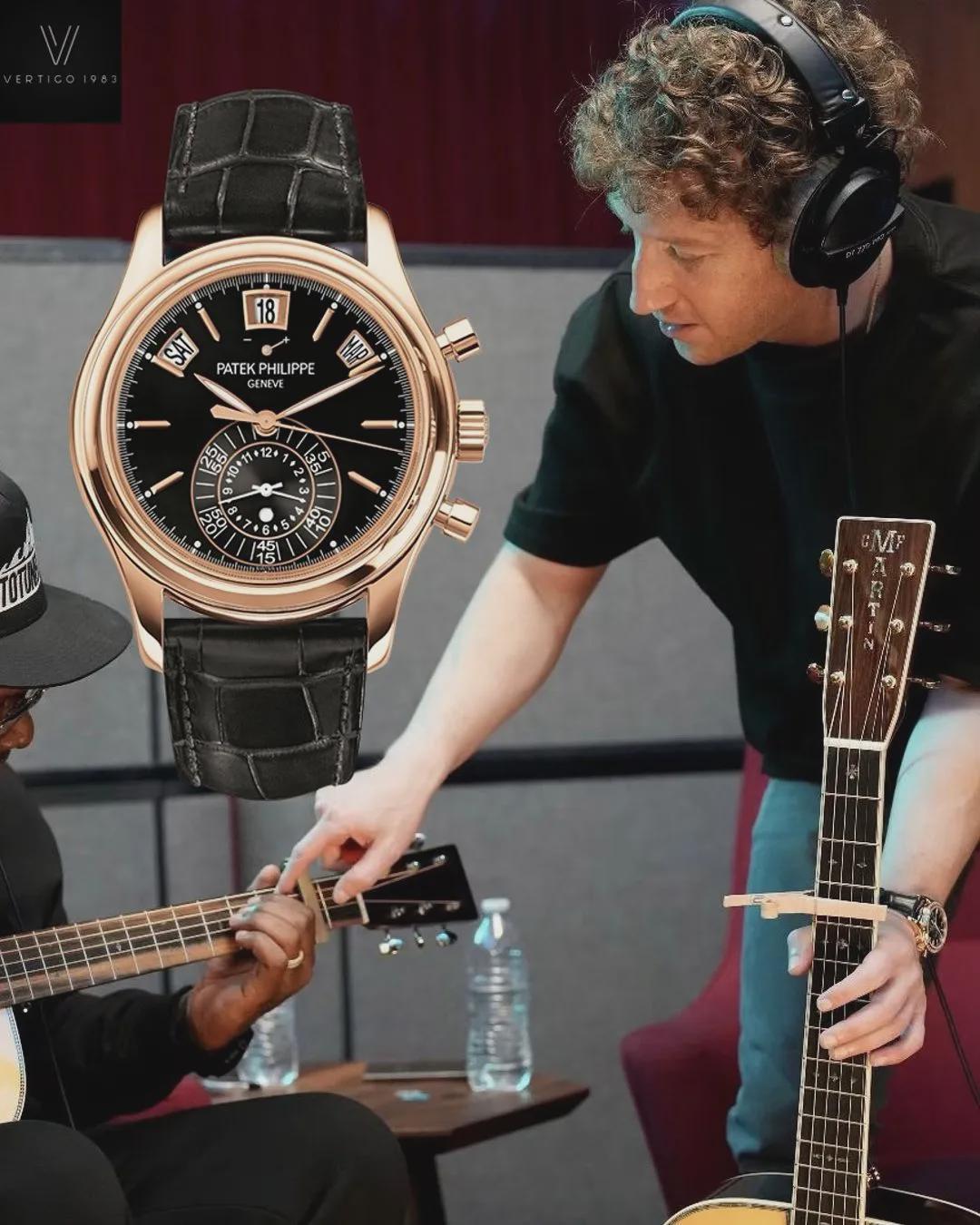 和美国歌手T-Pain合作做音乐时,腕上又赫然出现一枚百达翡丽5961R年历计时码表,是已经停产的表款,黑金配色+复杂功能很高调。