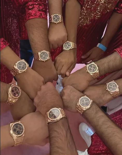 结婚时还送25块定制版爱彼万年历腕表给伴郎,每块价值超过170万人民币,合影太有冲击力↓