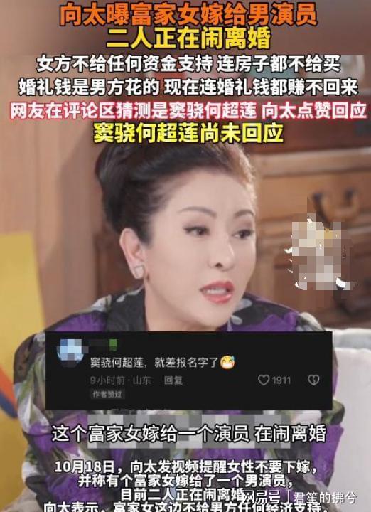 如今,男方复出拍戏却难以挣回婚礼的成本,两人因经济压力和情感矛盾而闹离婚。虽然视频中没有直接点名,但向太主动点赞了评论区中猜测“窦骁、何超莲”的留言。