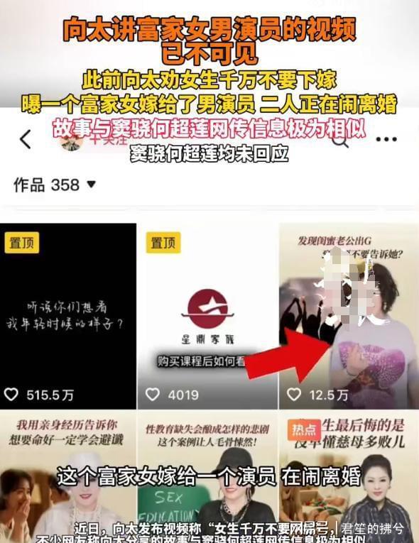 向太在社交平台上发布了一段视频,提出了关于“下嫁”的观点,并讲述了一个富家女嫁给男演员的故事,其中透露了不少细节。