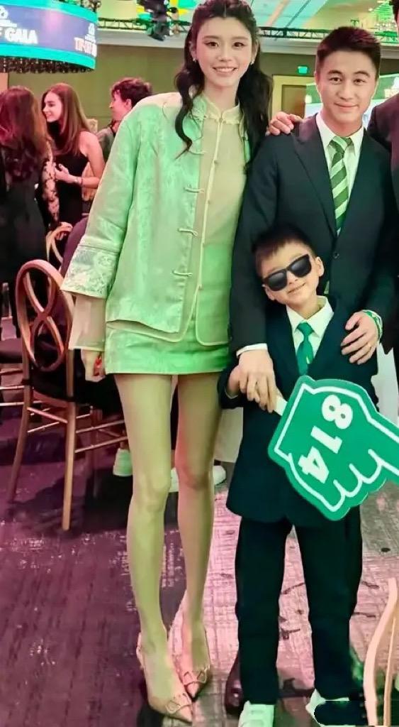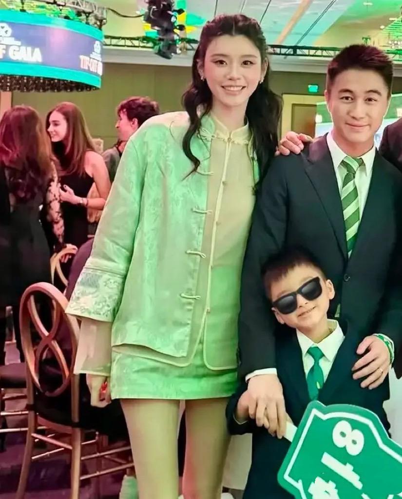 当晚何猷君身着白色衬衫搭配西装裤,尽显绅士风度。尽管站在平均身高超2米的NBA球星身旁,这位豪门公子仍以强大气场hold住全场。更引人注目的是,他特意为妻儿打造了协调的着装方案——父子俩的黑色西装点缀绿色系领带与袖口,与奚梦瑶的浅绿色新中式刺绣套裙形成完美呼应。