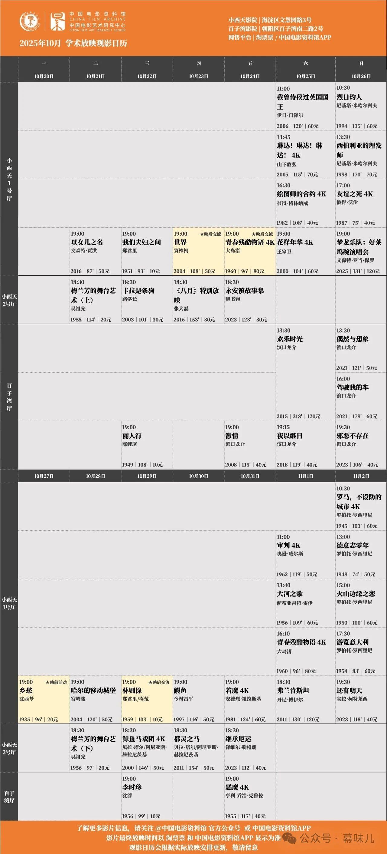 所有场次均可通过淘票票、中国电影资料馆APP购票,具体排片信息详见末图。祝各位观众观影愉快!❤️