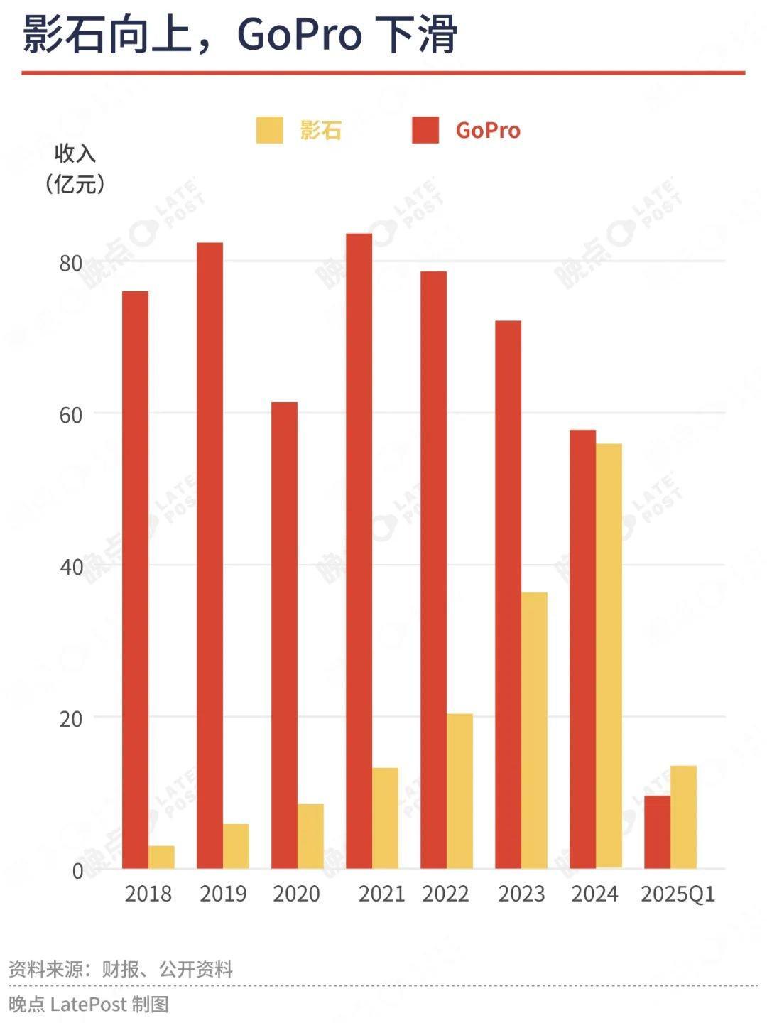 值得注意的是,影石的营收在短短两年内暴增,从2018年到2020年,营收从2.58亿元跃升到8.5亿元。与此同时,曾经主导运动相机市场的GoPro却持续滑坡,2020年营收同比下降了22%,从11.48亿美元跌至8.92亿美元。
