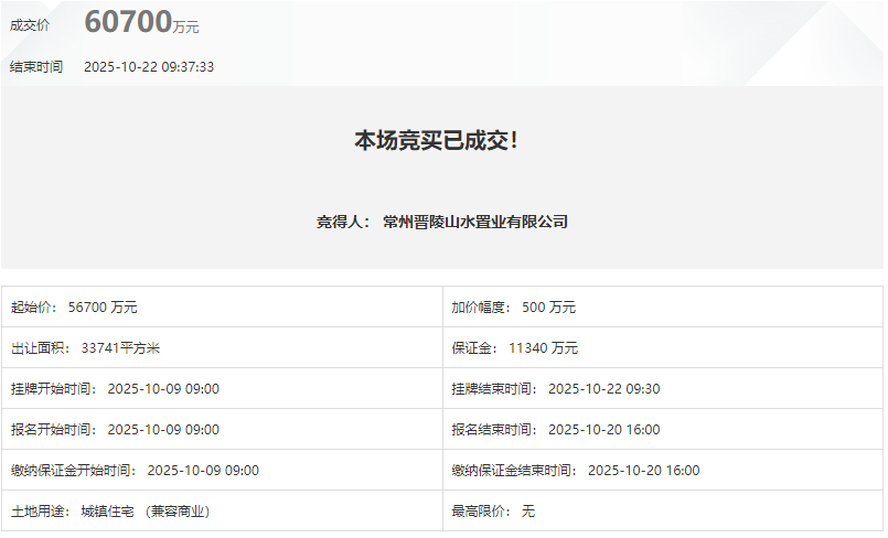 10月22日,晋陵公司成功竞得和平北路西侧、吊桥路北侧地块(乌衣浜及开放大学周边地块),成交总价高达60700万元,成交楼面价达到15643元/㎡。