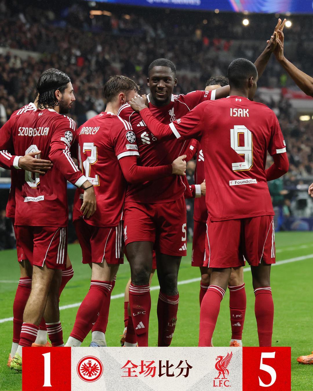 北京时间10月23日凌晨,欧冠联赛阶段第3轮迎来一场焦点战,由法兰克福主场迎战利物浦。最终,利物浦凭借埃基蒂克、范戴克、科纳特、加克波、索博斯洛伊的精彩进球,以5-1客场逆转法兰克福,终结了各项赛事的4连败颓势。