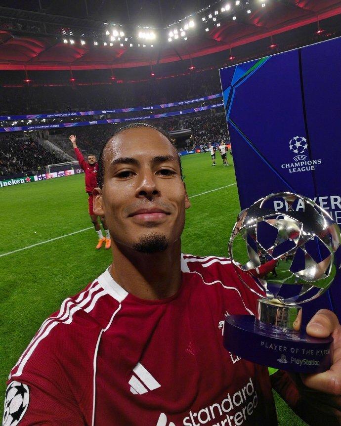 范戴克也凭借第38分钟的头球破门当选全场最佳球员!