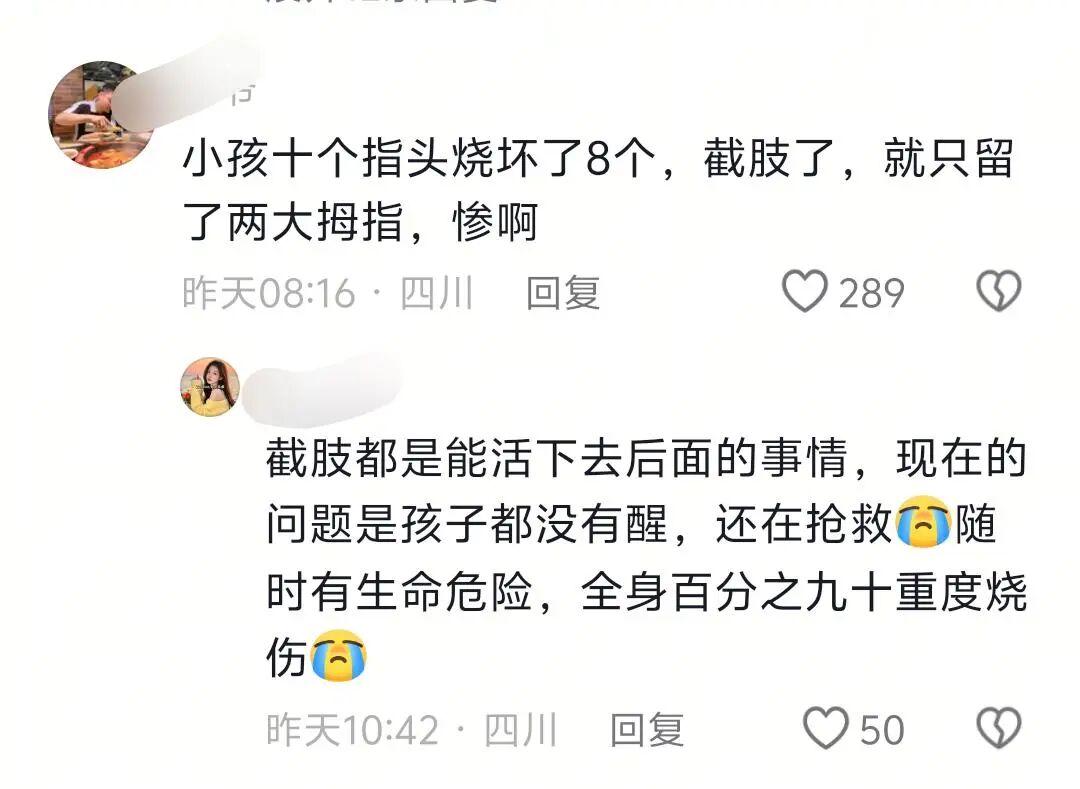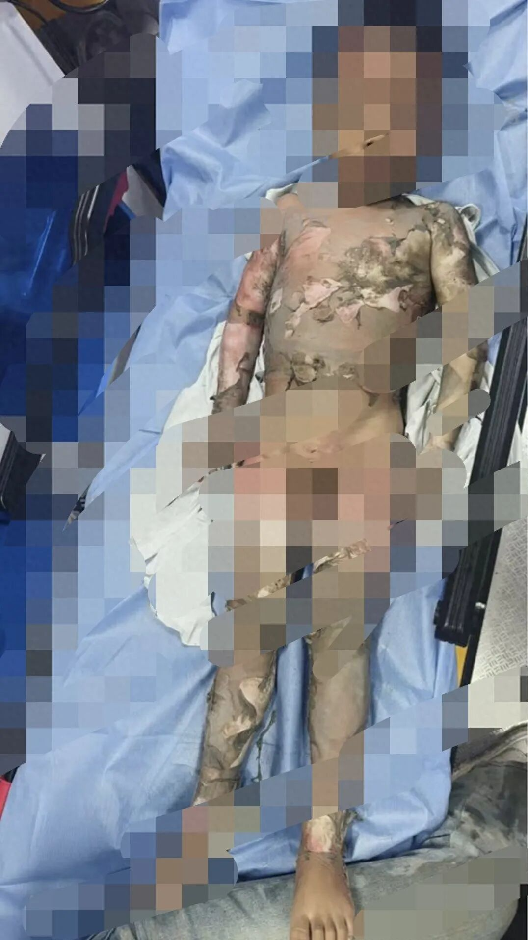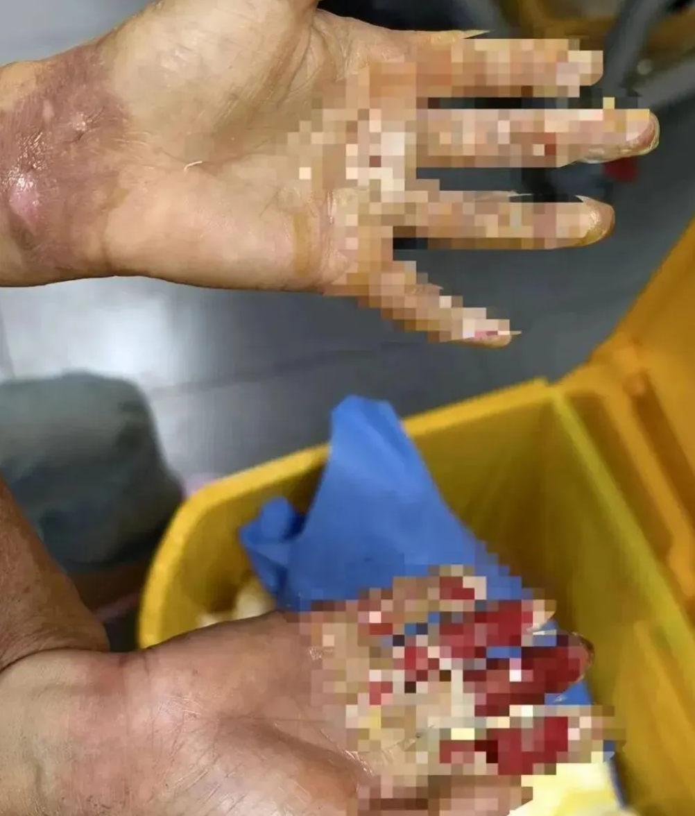 医生检查小孩的手部伤势,说左手手指基本已经坏死,右手也大概率要截肢,以后吃饭、穿衣都得靠父母喂。16号晚上10点多,小男孩刚进烧伤科就被紧急转去了重症监护室,直到18号都没脱离危险期。医生说现在每小时都得盯着,随时可能出现感染、器官衰竭。