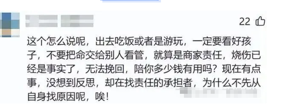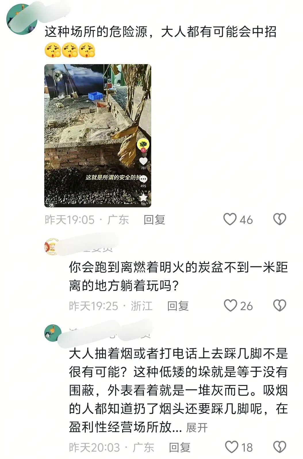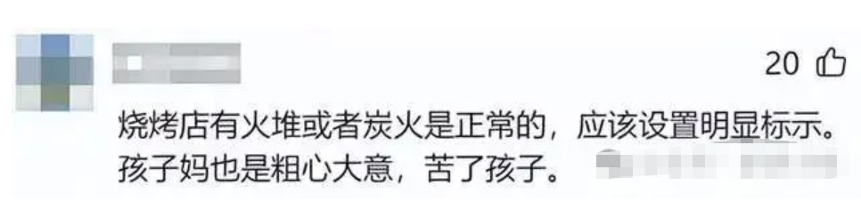其实在我看来,这应该是餐厅的责任更大,毕竟那堆炭火就放在过道边,围栏矮得还没孩子膝盖高,也没有什么提示的牌子,这就有很大的安全隐患。有人看了现场的图片,觉得太危险了,即使是大人也有可能不小心踩进这个炭火堆,更不要说小孩子那么调皮了。