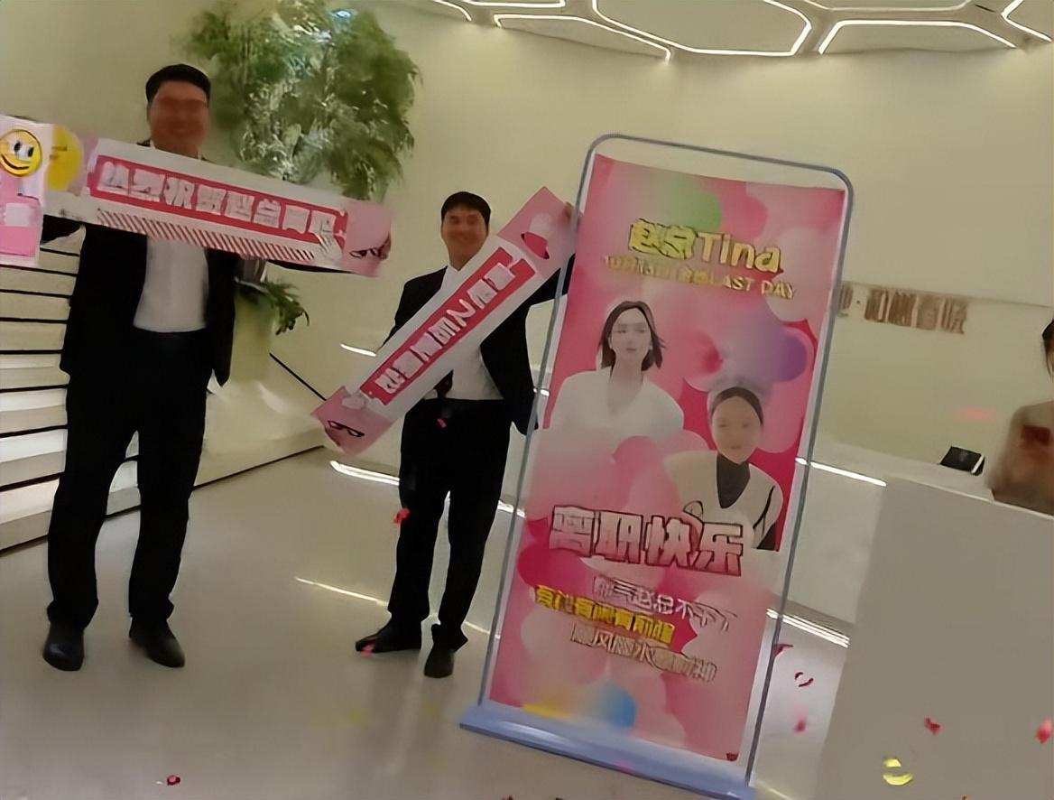 员工们拉着横幅立着牌子,上面写着离职快乐,现场还放了炮仗。搞得跟过年似的。