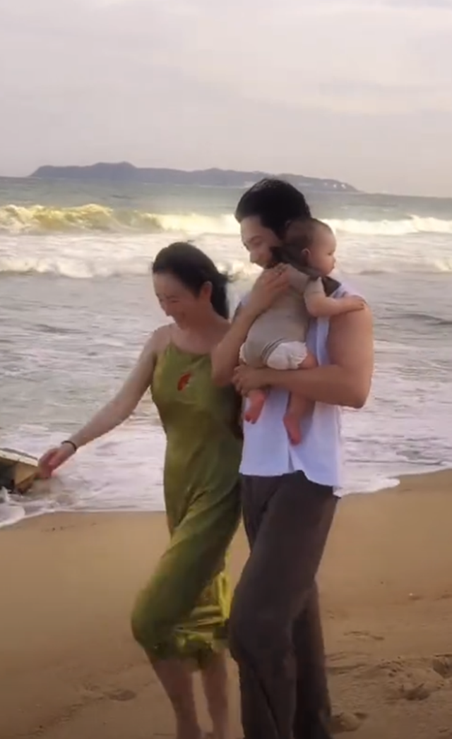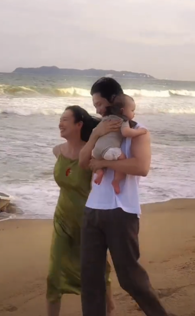 视频中,小五怀中抱着6个月大的儿子,张檬则伸手挽着老公的手臂,一家三口在松软的沙滩上悠闲漫步,欣赏着海景,画面充满了温馨与爱意。