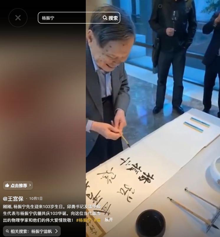 王宫保与杨振宁交情深厚,10月1日他发布的杨振宁103岁生日庆祝视频中,杨老虽头发花白、腰背微弯,但精神矍铄,还挥毫写下毛笔字。然而仅隔半月余,这位科学巨匠便溘然长逝,令亲友错愕不已。据王宫保透露,杨老临终前意识清醒,明确拒绝插管治疗。