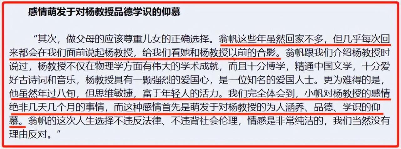 面对54岁的年龄差争议,翁帆父亲表示支持女儿的选择。他认为这段婚姻既不违法也不违背伦理,感情非常纯洁。翁帆为照顾杨老晚年做出牺牲,是一种美德和荣幸。