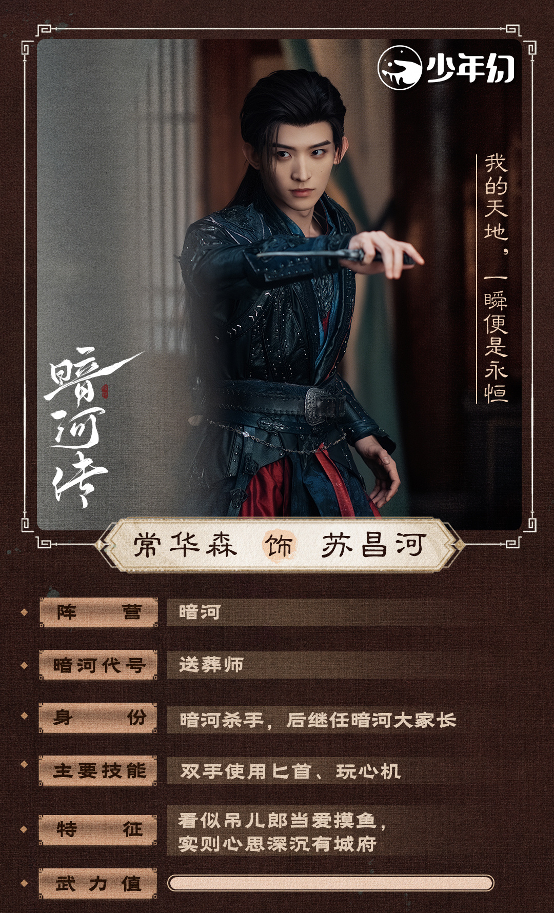 在百鬼窟的试炼中,苏暮雨始终背负重伤的挚友苏昌河走出绝境,成为三百年来唯一打破「单人存活」规则的例外。冠姓之礼后,无剑城少城主消失,暗河苏暮雨诞生。这对性格迥异的兄弟:一个沉默寡言如执伞鬼,一个张扬外向似送葬师,却共同立下「带领暗河走向光明」的誓言。