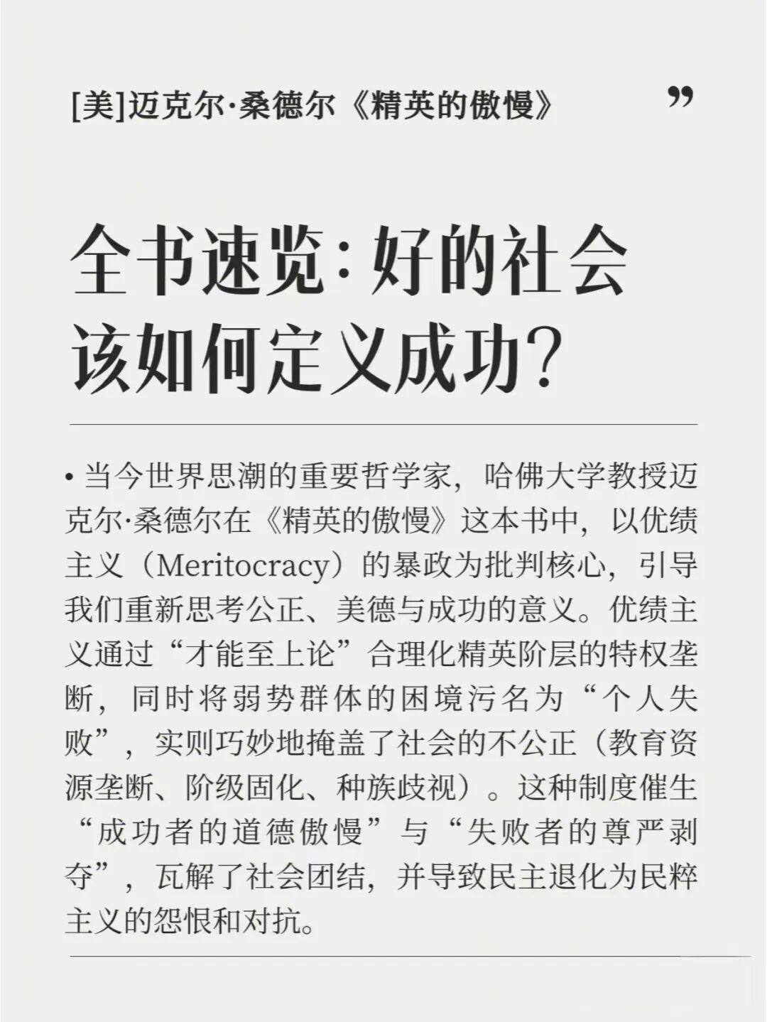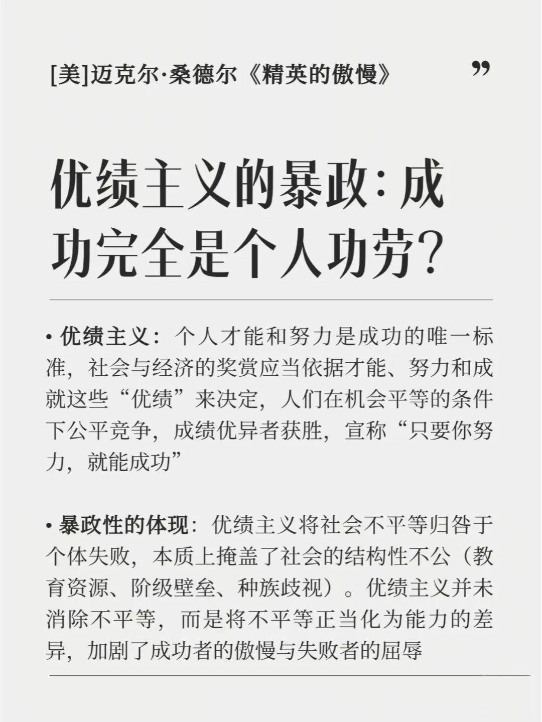 显而易见,在这场我们与“倩倩”的容忍和厮杀中,优绩主义才是那个始作俑者,桑德尔在《精英的傲慢》一书中曾对优绩主义做出了解释:优绩主义认为个人能力和努力是通往成功的唯一标准,宣称“只要努力,就能成功”,但事实上成功并非如其所言,优绩主义此番论调反而加剧了成功者与失败者的矛盾。