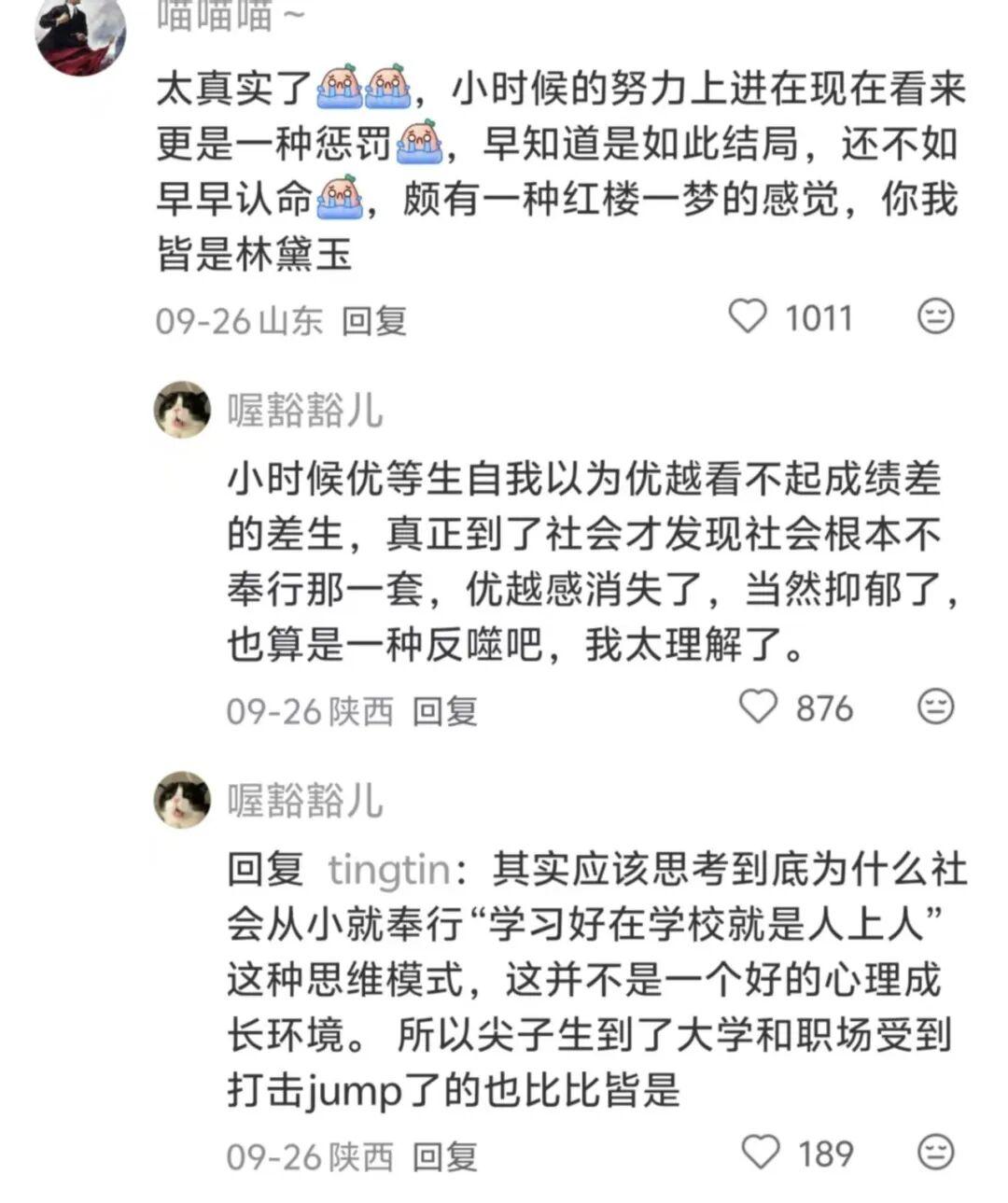 原因在于,“嘉豪”活在自己的世界里,跳出了学生时代主流的竞争赛道。而“倩倩”并未试图反抗学校里那一套“成绩”“排名”的优绩主义评价系统,她在这个系统中如鱼得水、乐在其中。