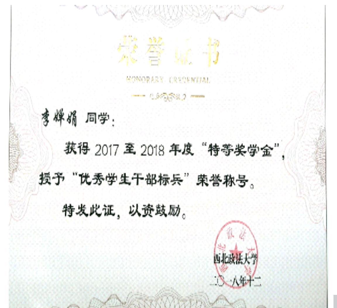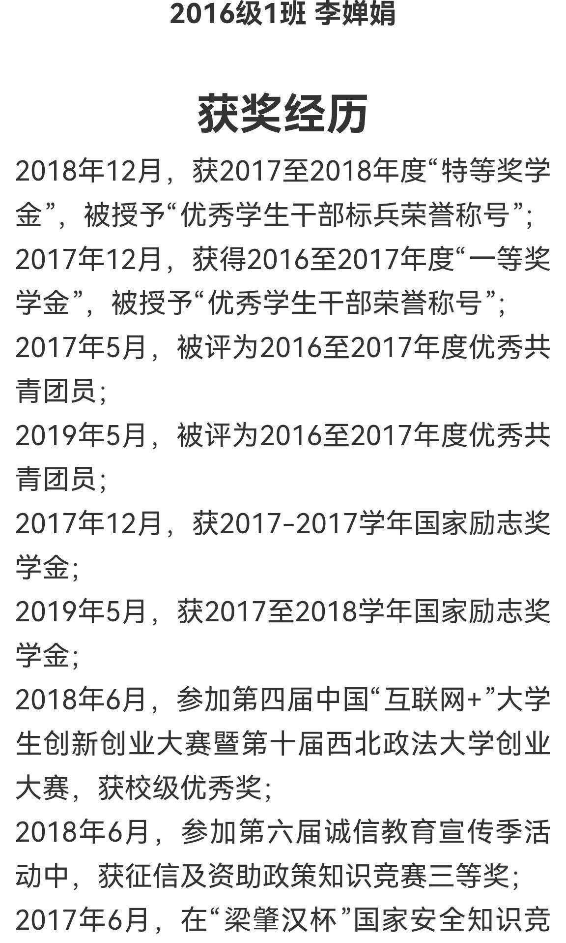 以下是李婵娟在大学期间获得的部分荣誉,这些荣誉不仅见证了她的成长,也彰显了她的优秀。大家可以在西北政法大学网站上查询相关详情。
