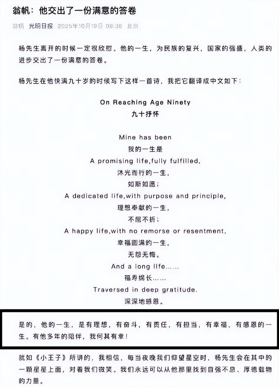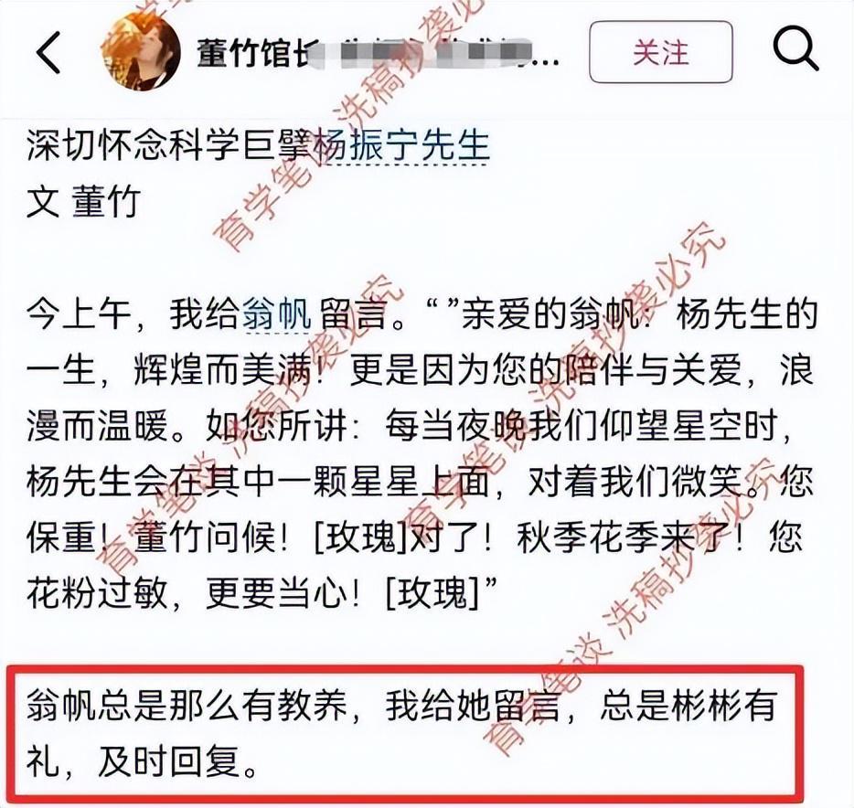 直到杨振宁去世后,这种刻板印象才被彻底打破。杨振宁离开的第二天,翁帆在《光明日报》公开发文,纪念先生的一生。她说,他交出了一份满意的人生答卷。不多的文字中,浓缩了宇宙大爱和人间真情。