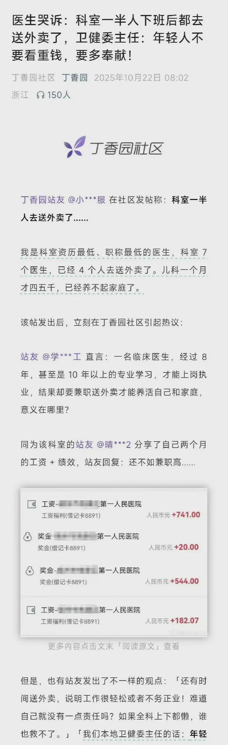 近日,丁香园社区发布的一篇题为《有医生哭诉,科室一半人下班之后都去送外卖了》的文章引发广泛关注,该帖子累计浏览量已突破26.6万次。文章揭示了当前医疗行业部分从业者面临的生存困境,尤其是儿科医生群体。