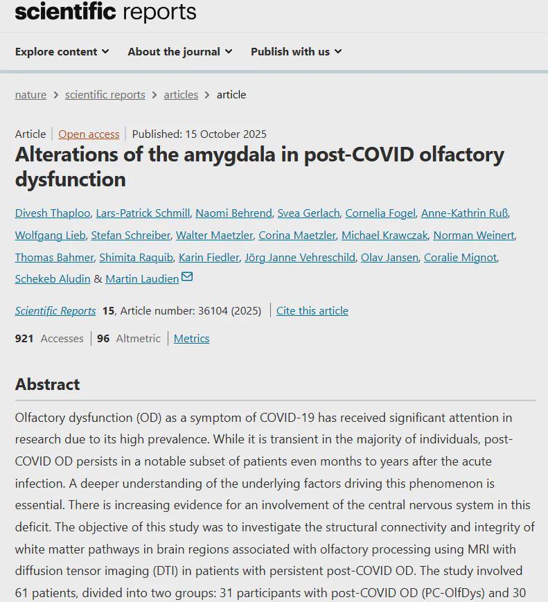 这项发表于2025年10月15日《科学报告》(Scientific Reports)的研究首次证实,持续性嗅觉丧失绝非“小事”,它可能是大脑结构改变的早期信号。杏仁核的物理变化与情绪障碍的关联,也揭示了长新冠患者面临的深层生理危机。