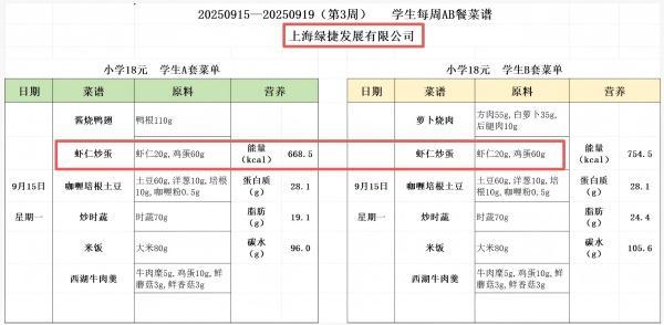 多位家长反映,问题虾仁炒蛋被临时撤换后,学校仅提供饼干、面包作为替代。记者从闵行区某公立小学获悉,自2024年秋季学期起,上海推行AB制学生午餐(每日提供两种套餐),但涉事菜品仍出现在9月15日菜单中,每份定价18元。
