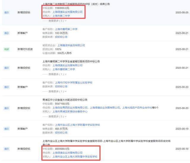 涉事供应商上海绿捷实业发展有限公司(以下简称“绿捷公司”)回应称“仅部分批次存在问题”,承诺加强食品安全监管,但未对具体整改措施作出详细说明。据天眼查数据显示,该公司业务覆盖上海16个区500余所中小学及幼儿园,日供餐量超50万份。