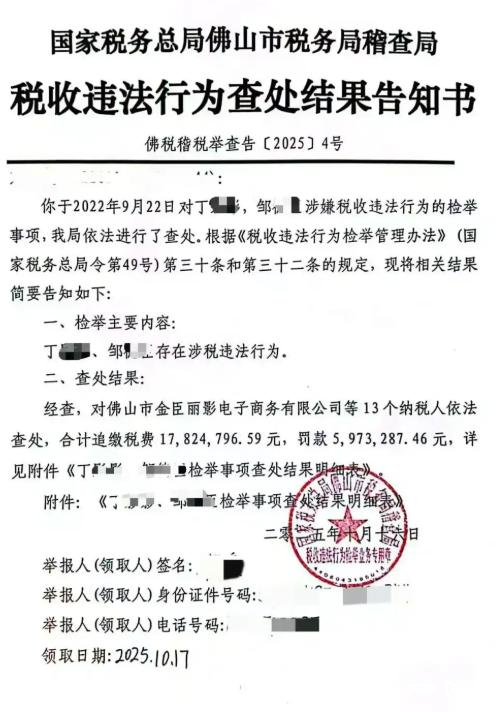 据华商报大风新闻报道,拥有近千万粉丝的网红“小影夫妇”被23人实名举报涉嫌偷税。实名举报人樊女士透露,她已拿到税务部门出具的查处结果告知书,显示小影夫妇所有公司等13个纳税人因偷逃税被广东佛山市税务局稽查局查处,合计追缴税费17824796.59元,罚款5973287.46元。