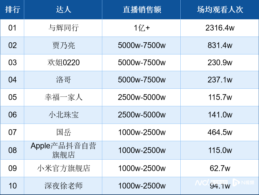 抖音10月23日直播带货日榜显示,与辉同行以超1亿元销售额排名第一,贾乃亮、欢姐以超5000万元销售额位列二三位。