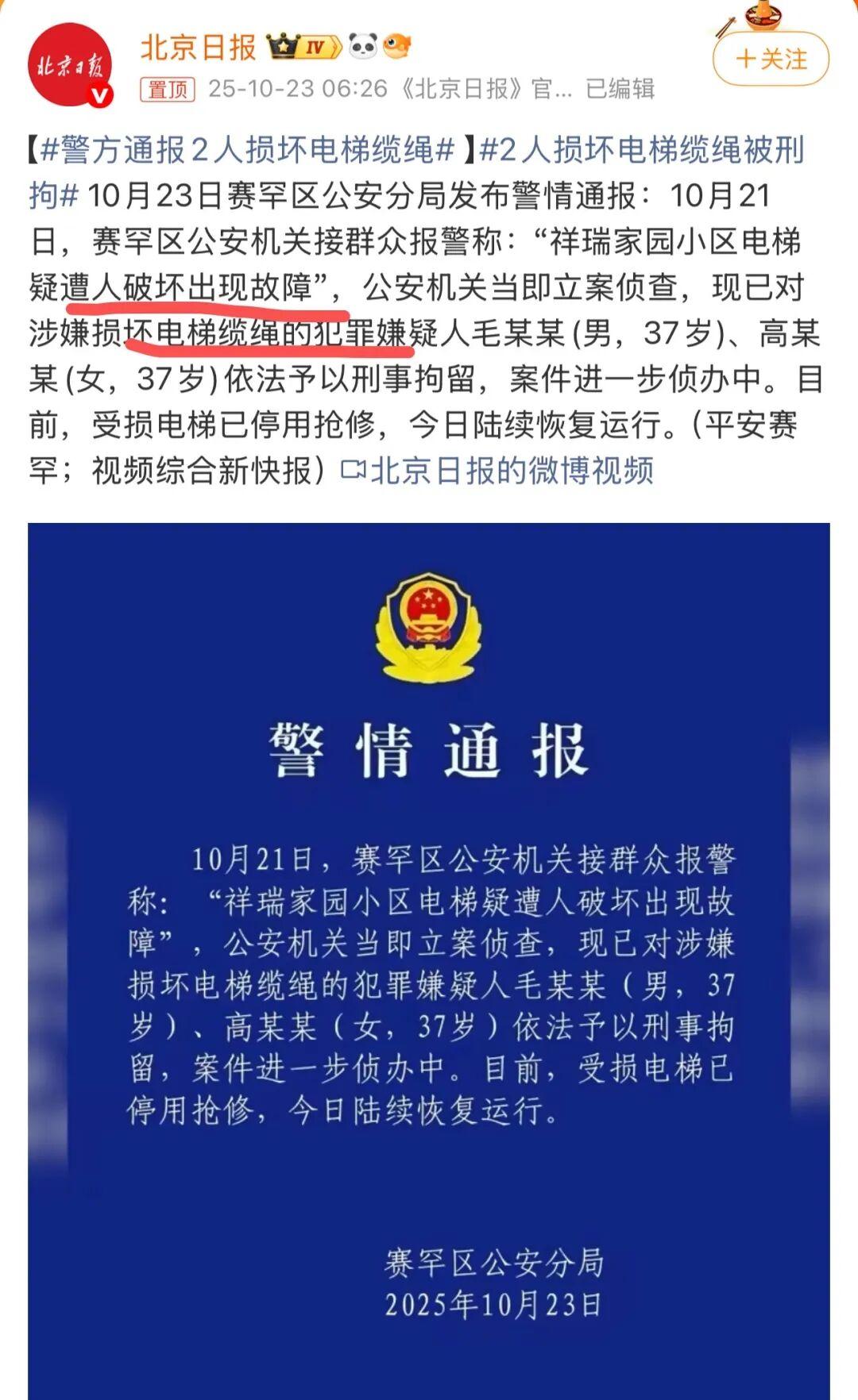 近日,内蒙古某地一小区发生的电梯缆绳遭人为破坏事件,便是一例。据警方通报,一男一女因涉嫌破坏电梯缆绳已被刑拘。