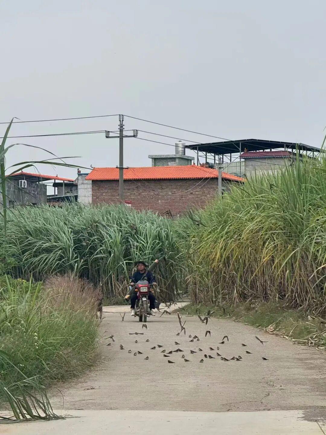 一摩托一男子,两只奔跑的狗子,几十只拦路觅食的鸟,道两旁是甘蔗林,这便是我心中最美妙的自然。
