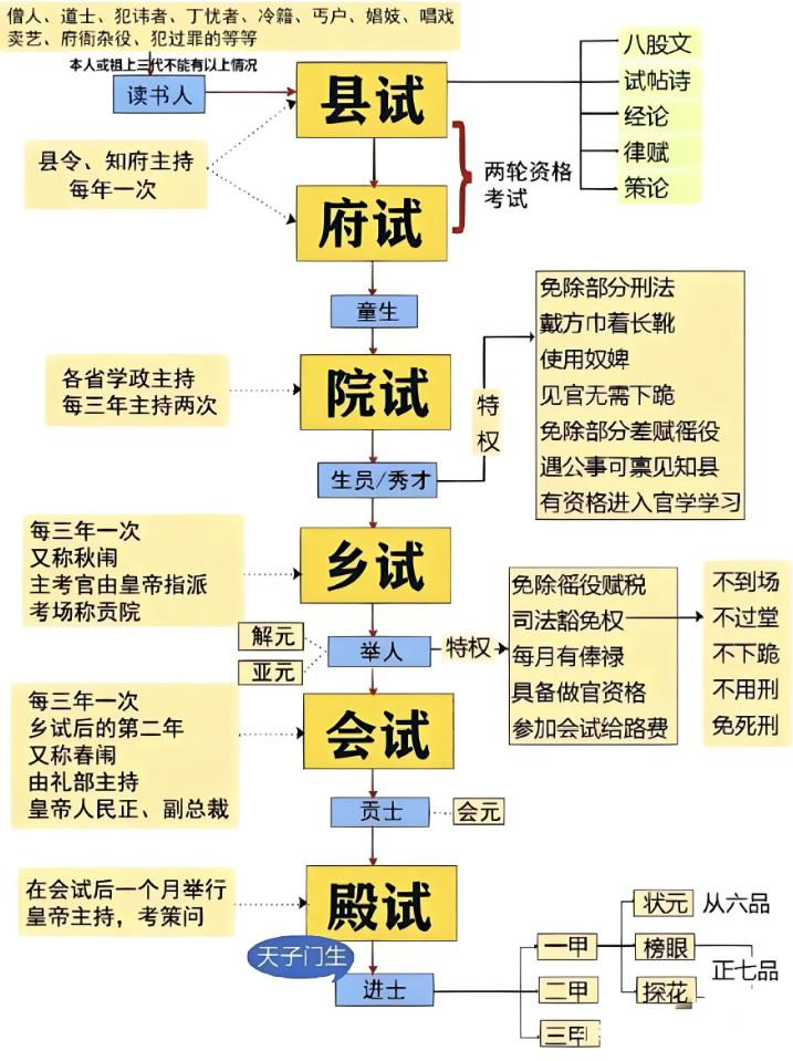 明清科举如同一场持续数十年的“通关游戏”,分为“三级四试”。能走到举人这一步,堪比现代普通人卷成清北博士。